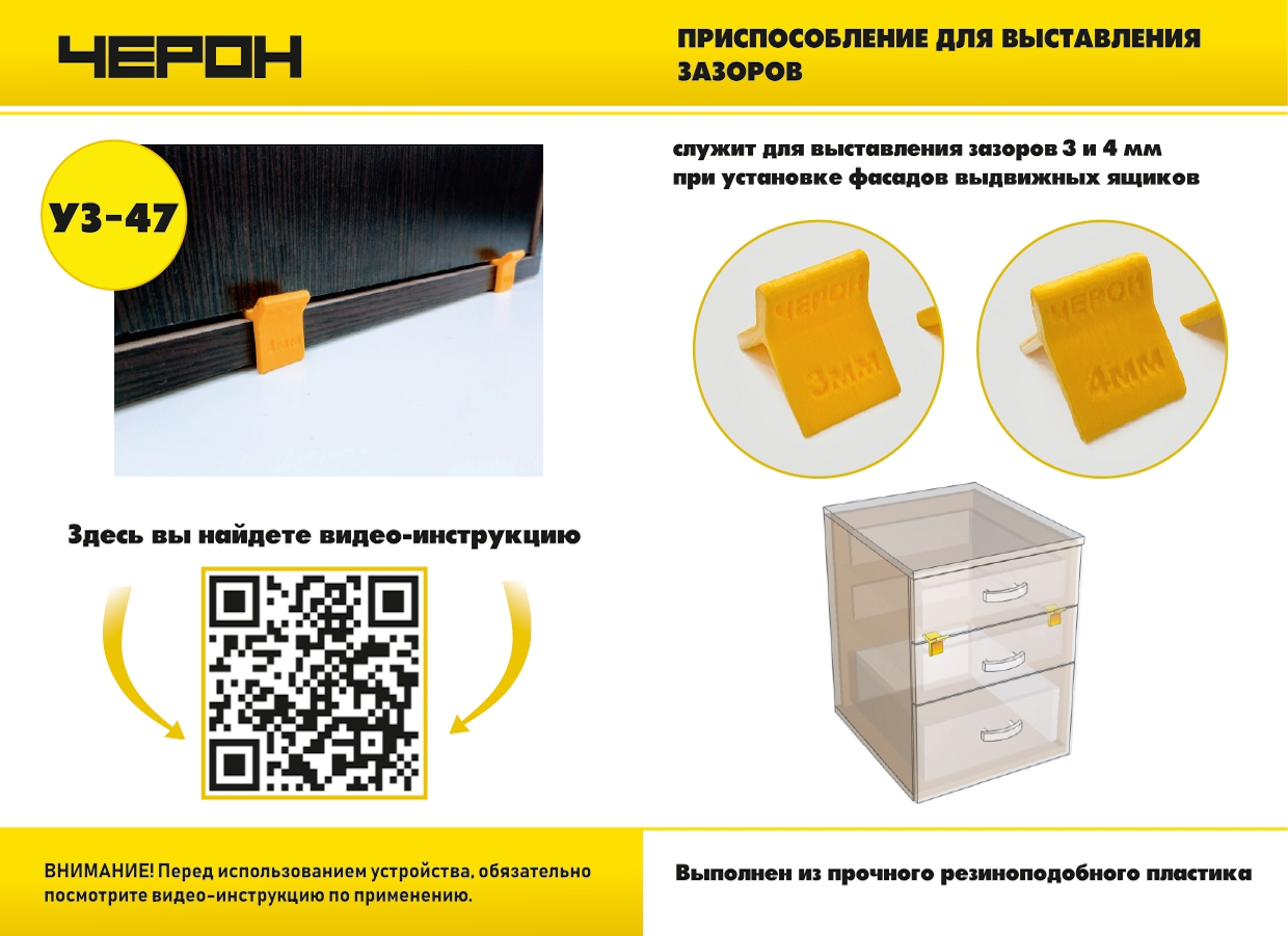 Основное предназначение УЗ-47 - выставление зазоров между фасадом выдвижного ящика и его корпусом. Приспособление имеет два язычка, соответствующие зазорам 3 и 4 мм. Каждый язычок помечен специальной маркировкой, что позволяет легко выбирать нужный зазор в соответствии с требованиями проекта.
