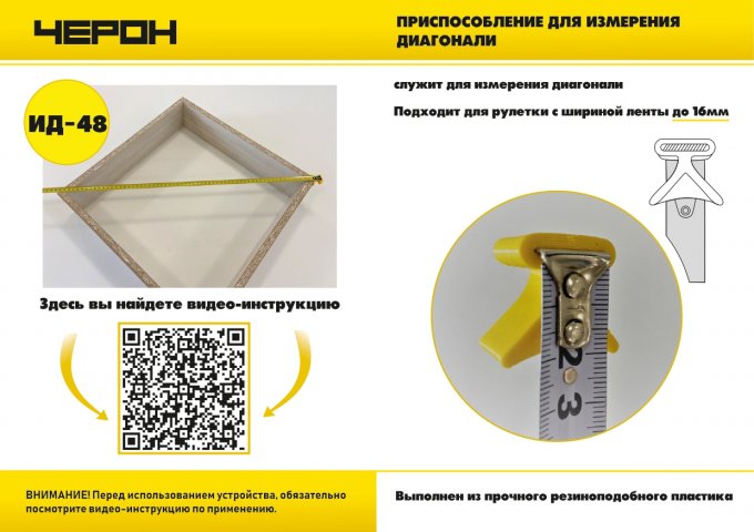 ИД-48 от компании Черон — это инструмент, который значительно упрощает процесс измерения диагоналей с помощью обычной рулетки. Оно идеально подходит для использования в строительстве, ремонтных работах и других проектах, где требуется точное измерение и высокая скорость работы.