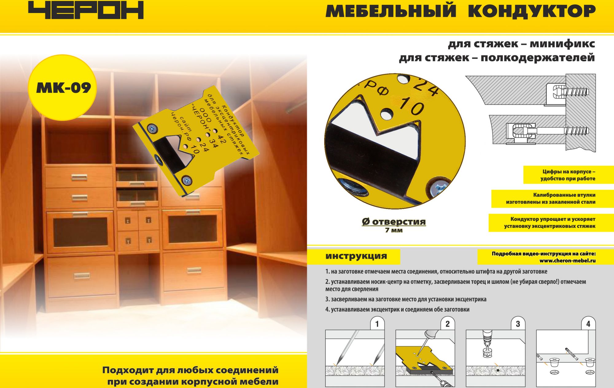 МК-09 - это инструмент, специально разработанный для установки полкодержателей и стяжек типа минификс в мебельных конструкциях. Он представляет собой надежное и эффективное решение для точной и надежной установки эксцентриковых стяжек.